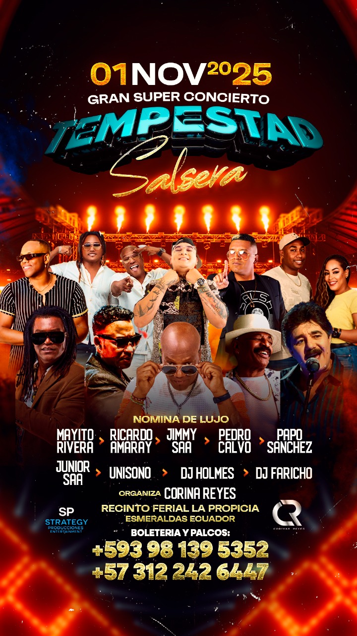 TEMPESTAD SALSERA, En Esmeraldas Ecuador, el sabado 01 de Noviembre 2025, CON JIMMY SAA, RICARDO AMARAY, PEDRO CALVO, MAYITO RIVERA, PAPO SANCHEZ, JUNIOR SAA, UNISONO, Y DJ FERCHO, DJ HOLMES Y LAS DIOSAS DE LA SALSA- Info +57 3122426447